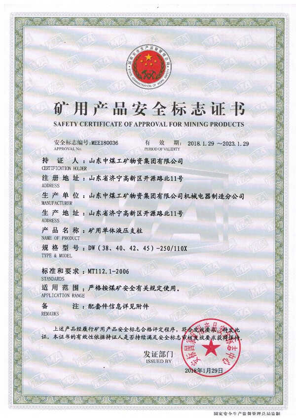 近日,山東中煤集團傳來捷報,由中煤集團機械公司生產的兩大系列(普通系列和懸浮系列),六大類的27種型號的礦用單體液壓支柱產品同時獲得國家礦用產品安全標志證書,此證書由安標國家礦用產品安全標志中心頒發,標志著我集團生產的液壓支柱系列產品在質量和安全方面得到了國家的認可。