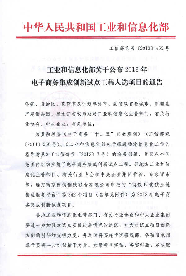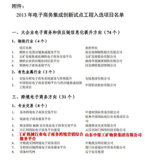為貫徹落實《電子商務“十二五”發展規劃》(工信部規〔2011〕556號)、《工業和信息化部關于推進物流信息化工作的指導意見》(工信部信〔2013〕7號)的有關部署,工業和信息化部在范圍內組織實施了電子商務集成創新試點工程。經地方工業和信息化主管部門、有關行業協會和中央企業集團推薦、專家評審等,確定山東中煤工礦物資集團有限公司為2013年電子商務集成創新試點項目入選企業。